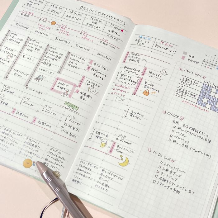 この5つに決まったスケジュール”やりたいこと”を書くだけで、やりたい”を叶えられる、続けられる手帳になっています。