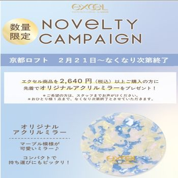 2月21日(土)、22日(日)の2日間限定で、京都ロフトにてエクセル商品を税込2,640円以上お買上げのお客さまに、「エクセル オリジナルグッズ」が必ずもらえるイベントを開催!