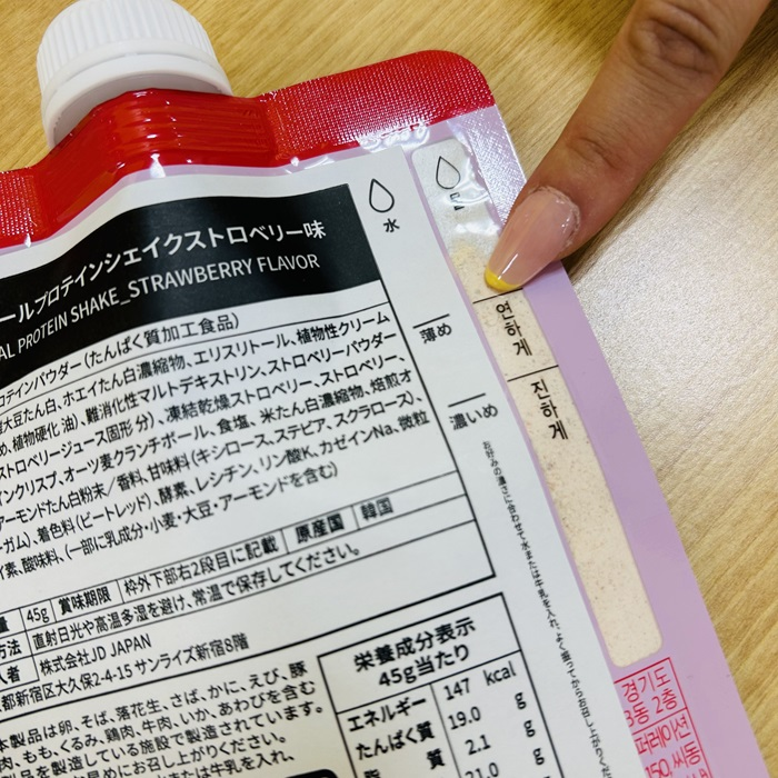 味は全部で6種類。シェイカーはいらず、水を注いで振るだけで簡単に作れ、プロテイン特有の風味や粉っぽさがないので飲みやすいです。パウチの裏面には「濃いめ」「薄め」の目安ラインがあるので、お好みの濃さに調整可能。ザクザクしたプロテインボールが入っているので、食感も楽しめて満足感もしっかりあります。1食置き換えダイエットや美容習慣として飲むのにおすすめです。