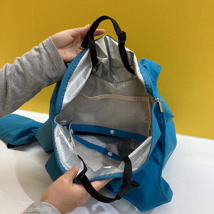 見た目は普通の大きめのエコバッグですが、中を開くとベルトがついていて、バーに合わせて調節が可能です。