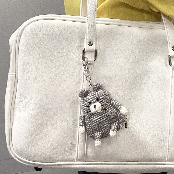 可愛い編みぐるみのバッグチャームに見えますが、その正体は、下に引っ張ると大きな音が鳴る防犯ブザーです。
