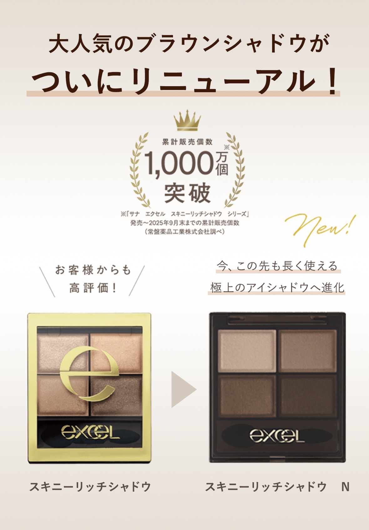 エクセルの「スキニーリッチシャドウ」をリニューアルした、「スキニーリッチシャドウ N」が登場。リニューアル前に比べて、よりなめらかな粉質でムラなく密着し、自然な陰影と上品なツヤを演出してくれます。また、くすみを目立ちにくく見せるパール設計で、見たままの発色が長時間続くのも魅力です。テクニックいらずで、洗練された大人の目元へ導くアイシャドウをぜひお試しください。