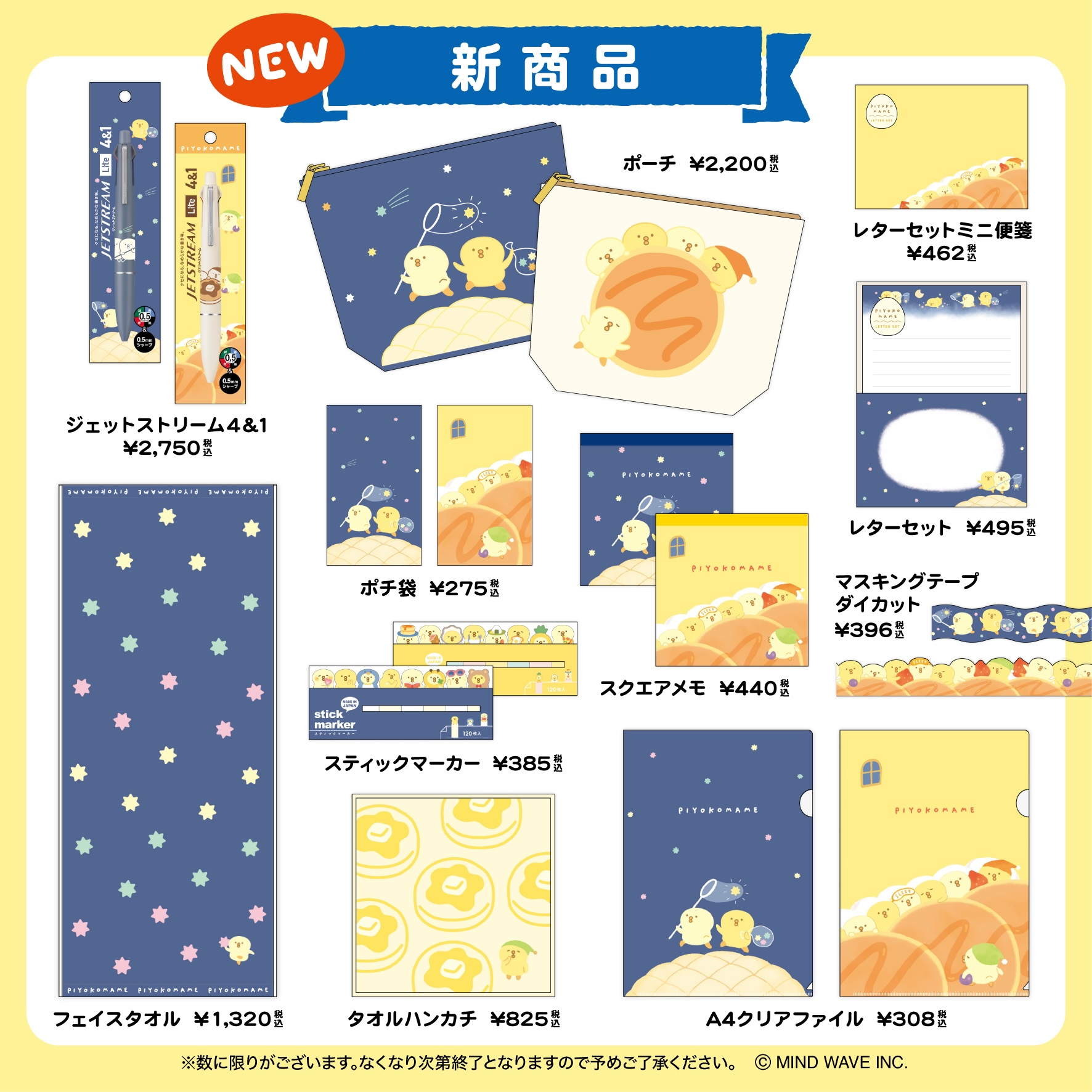 新発売となるぴよこ豆のジェットストリーム、ポーチ、レターセットミニ便箋、ポチ袋、スクエアメモ、レターセット、マスキングテープダイカット、スティックマーカー、タオルハンカチ、A4クリアファイルや各キャラクターのフェイスマスコットが会場にてお買い求めいただけます。
