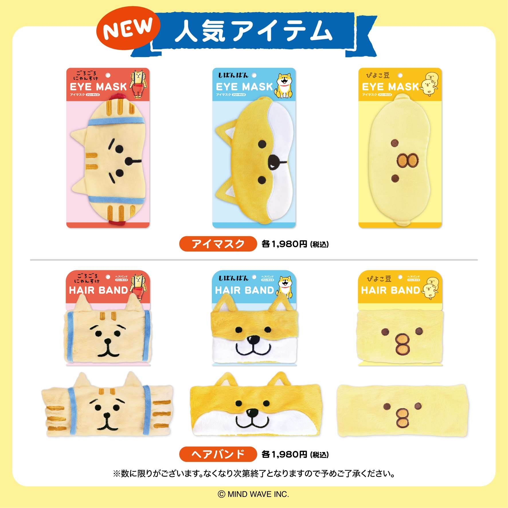 新発売となるごろごろにゃんすけ・しばんばん・ぴよこ豆の各キャラクターのふんばるず、アイマスク、ヘアバンドが会場にてお買い求めいただけます。