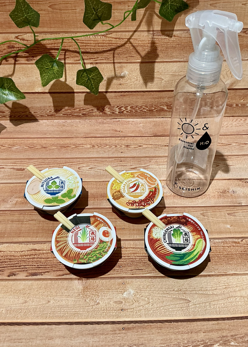 醤油ラーメンはネギ、塩ラーメンは三つ葉、味噌ラーメンは唐辛子、担々麺はチンゲンサイが育てられます。種まきの際には付属のミニ箸をご利用いただけますよ♪