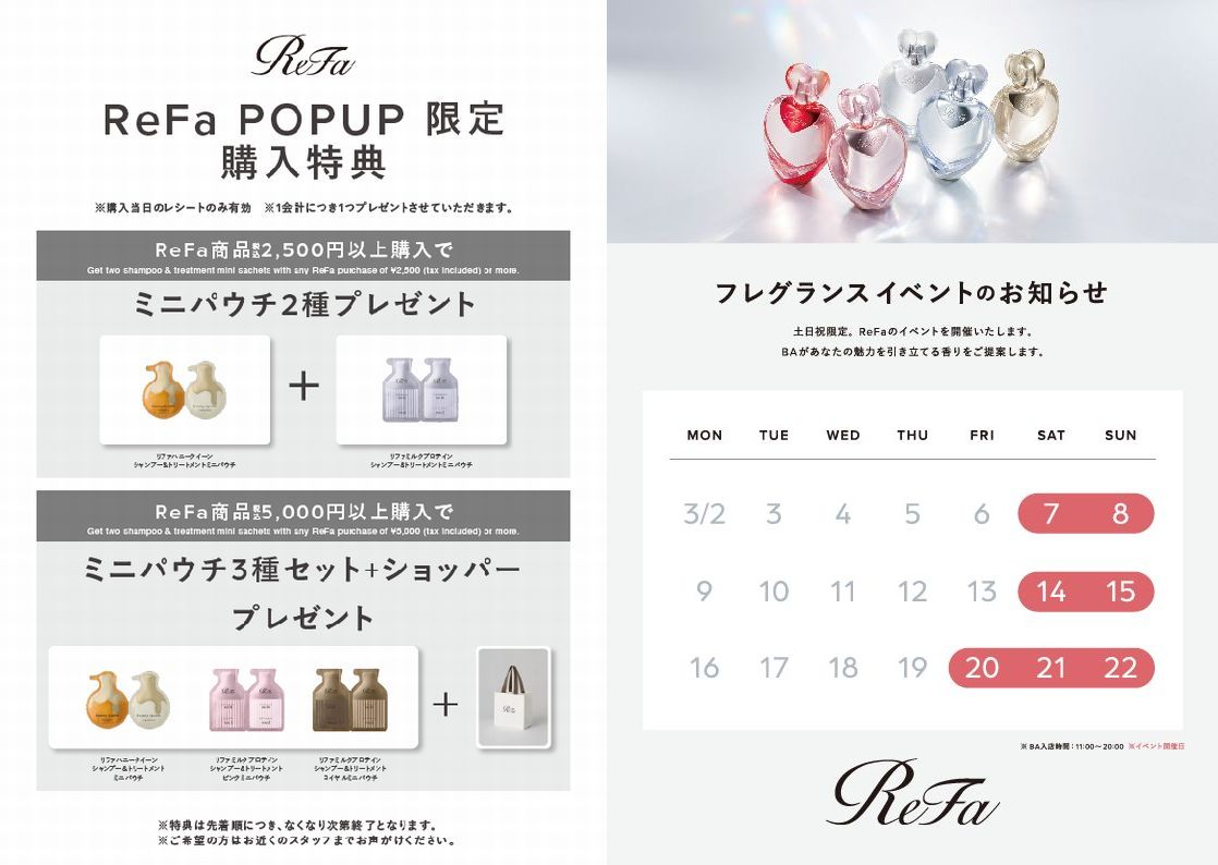 ②ReFa商品 税込5,000円以上ご購入でミニパウチ3種+ショッパープレゼント