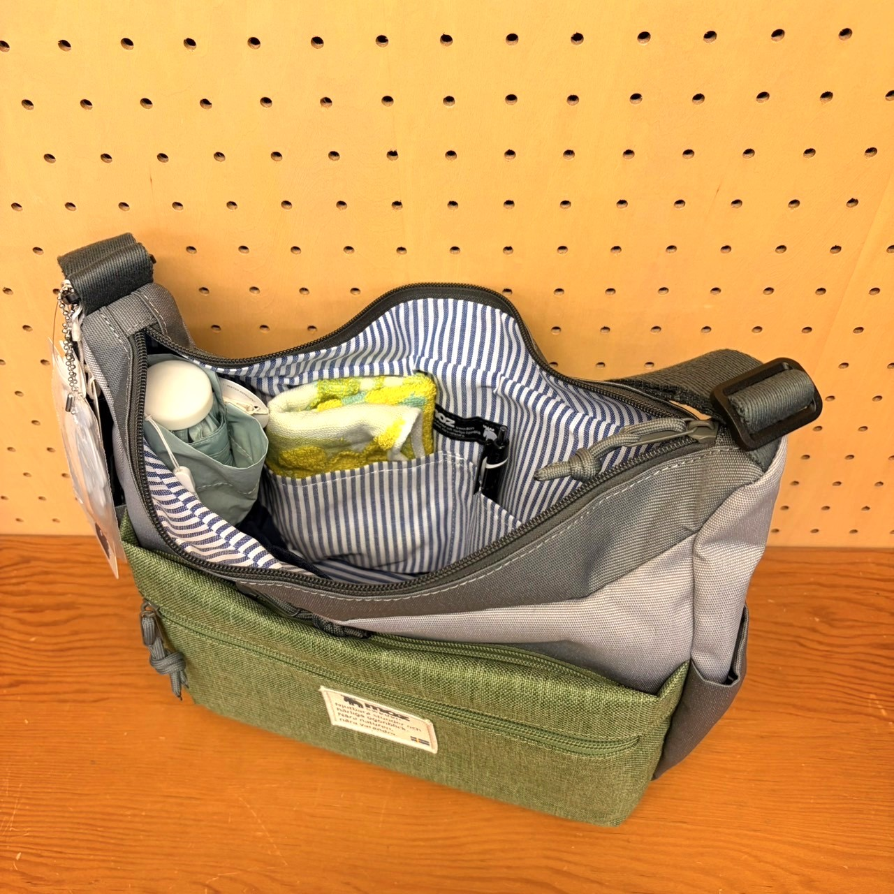 ベーシックなグレーにパッと映えるグリーンカラーと内生地の明るいブルーストライプは、春気分を高めるカラーリング。バックパックやトートバッグには、内装にボトルホルダーがついており使い勝手も抜群です。