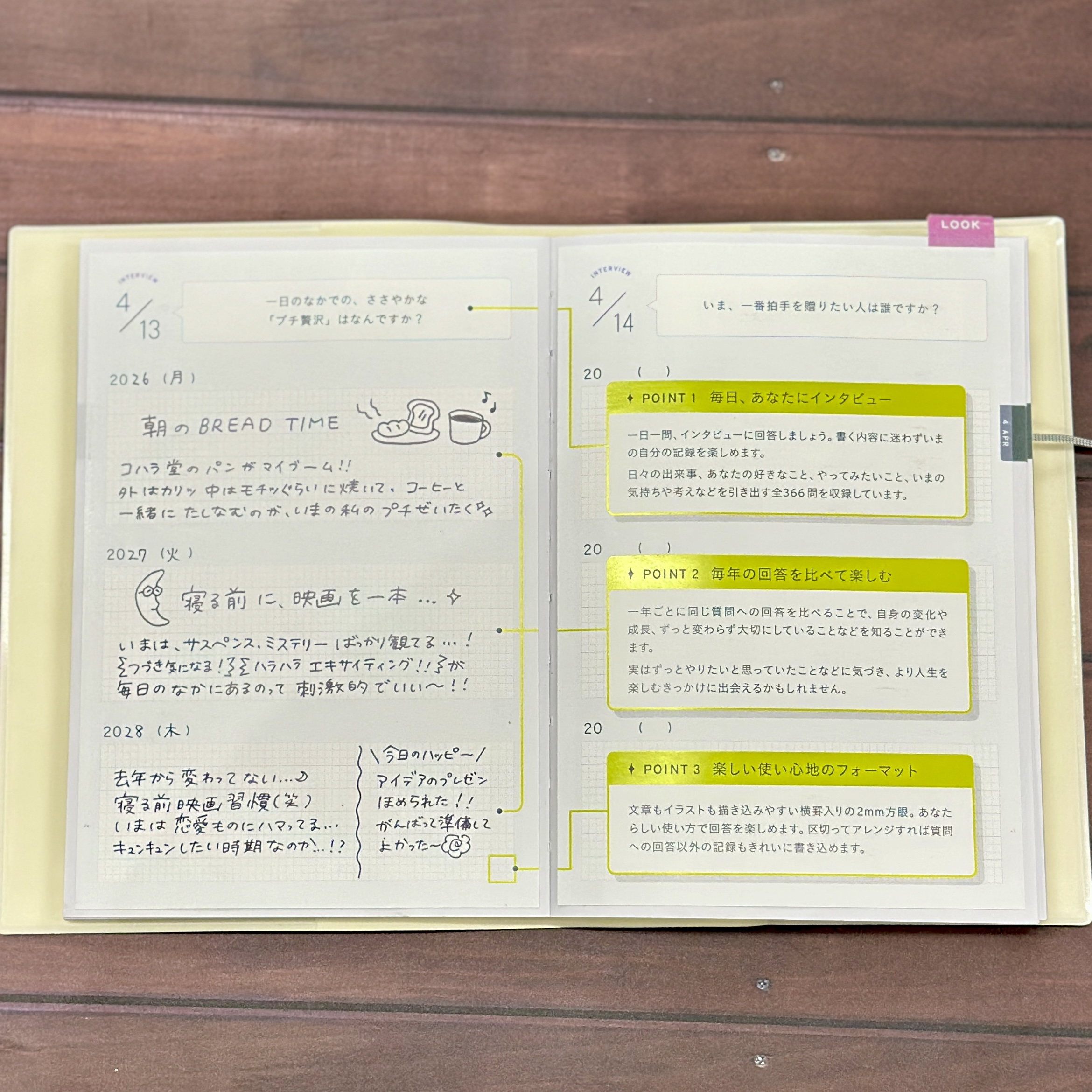 「3 YEARS INTERVIEW DIARY」は、1日1問のインタビュー形式で自分自身を記録できる日記帳です。