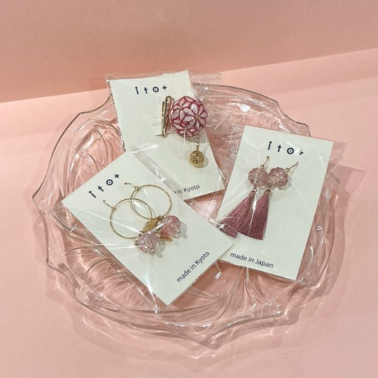 手まりをかんざしやクリップに仕立てたり、糸の美しさを生かした和のテイストを取り入れたアクセサリーを取りそろえました。