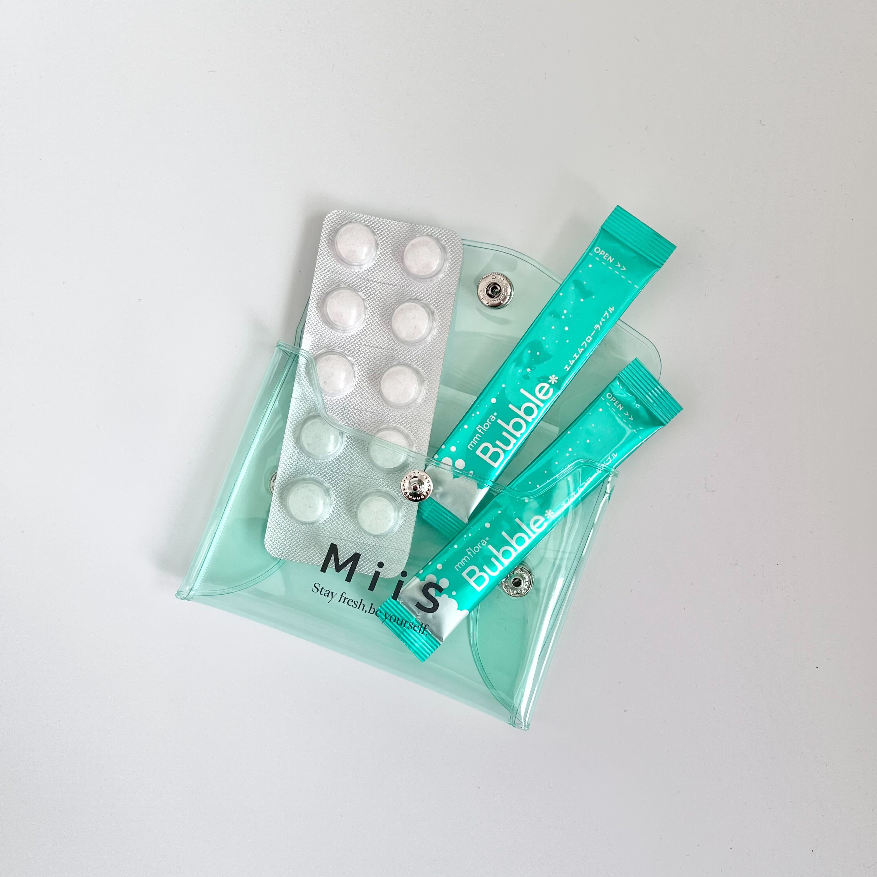 「エムエムフローラ」の新商品、「エムエムフローラバブル マスカットミント風味」を入れた数量限定のグリーンセットが、4月17日(金)までロフト先行発売中。エムエムフローラやエムエムフローラバブルを持ち運びできる、クリアポーチも入っています。日中忙しくて歯みがきをする暇がない時や、旅行、オフィス、おでかけ先で、お口のモヤモヤをすっきりリフレッシュしましょう。