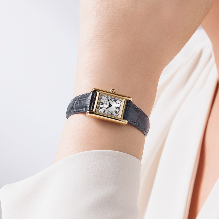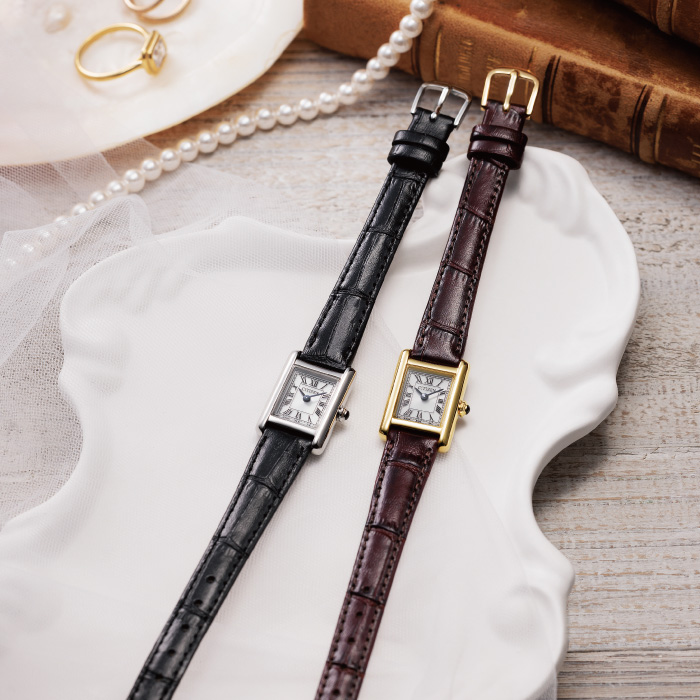 アンティークな雰囲気を漂わせながらも、優しさと落ち着きを感じるデザイン。サイドに丸みを持たせたケースが、洗練された優しさを醸し出します。ローマ数字で統一したインデックスと型押しを施した牛革バンドが、落ち着きのあるクラシカルな表情を際立たせています。