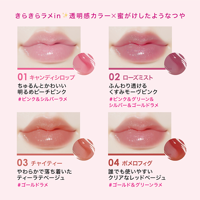 透明感のあるカラーと、蜜がけしたようなつやが続き、むちぷる唇に仕上がる『リップガーディアンN シロップラップティント』がキラキラのラメがかわいい全4色です。