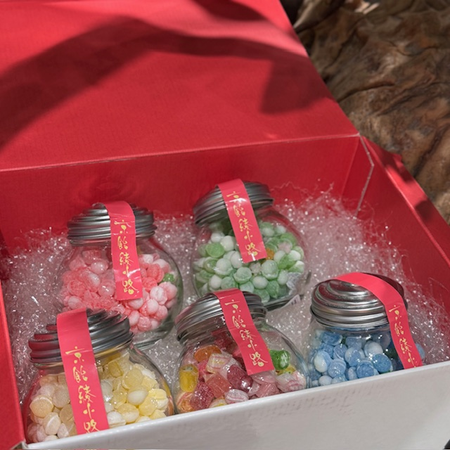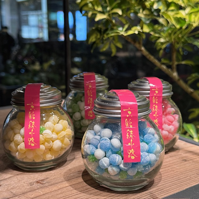 そんな、手まりを思わせる小さな京飴を、丸みのあるガラス瓶にぎゅっと詰め込みました。