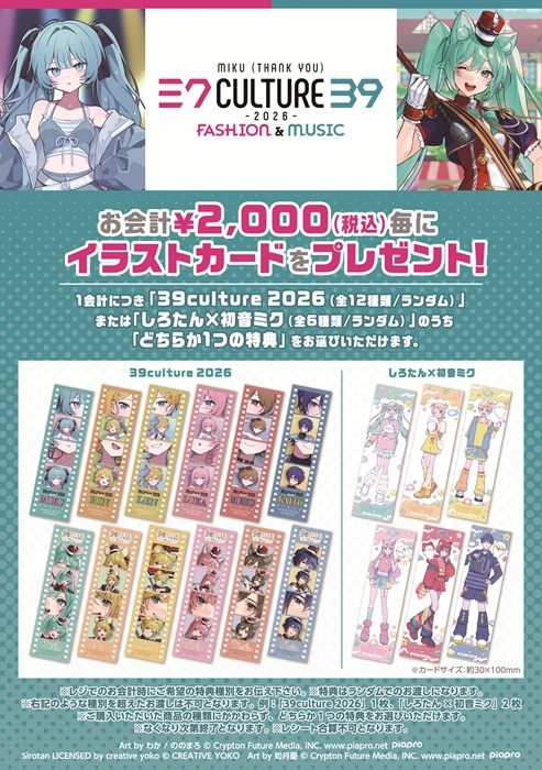 会場にて商品を1会計につきお1人さま税込2,000円以上お買い上げごとに、「①39Culture 2026(全12種類)」または「②しろたん×初音ミク(全6種類)」のうち「どちらか1つの特典イラストカード」をプレゼントいたします。