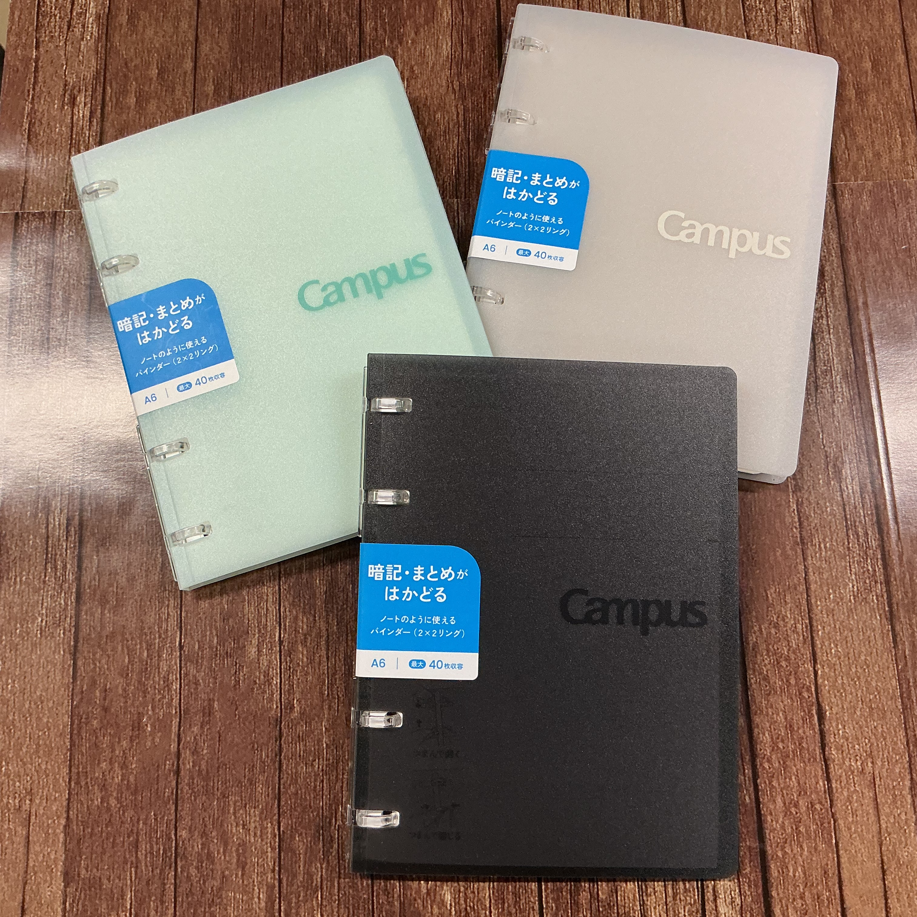 キャンパスより新シリーズが入荷しました。スキマ時間にどこでも見返せるコンパクトなA6・A7サイズのバインダー。折り返しても書きやすく、狭い机の上でも省スペースでお使いいただけます。色はグリーン・黒・グレーの3色です。同シリーズのルーズリーフや付箋もあります。