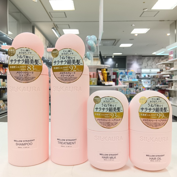 メロウストレートシャンプー:ラウロイル加水分解シルクNa(補修成分)、ラウロイルシルクアミノ酸Na(洗浄成分)、セリシン(保湿成分)、(ジヒドロキシメチルシリルプロポキシ)ヒドロキシプロピル加水分解シルク(保湿成分)、加水分解シルク(保湿成分)