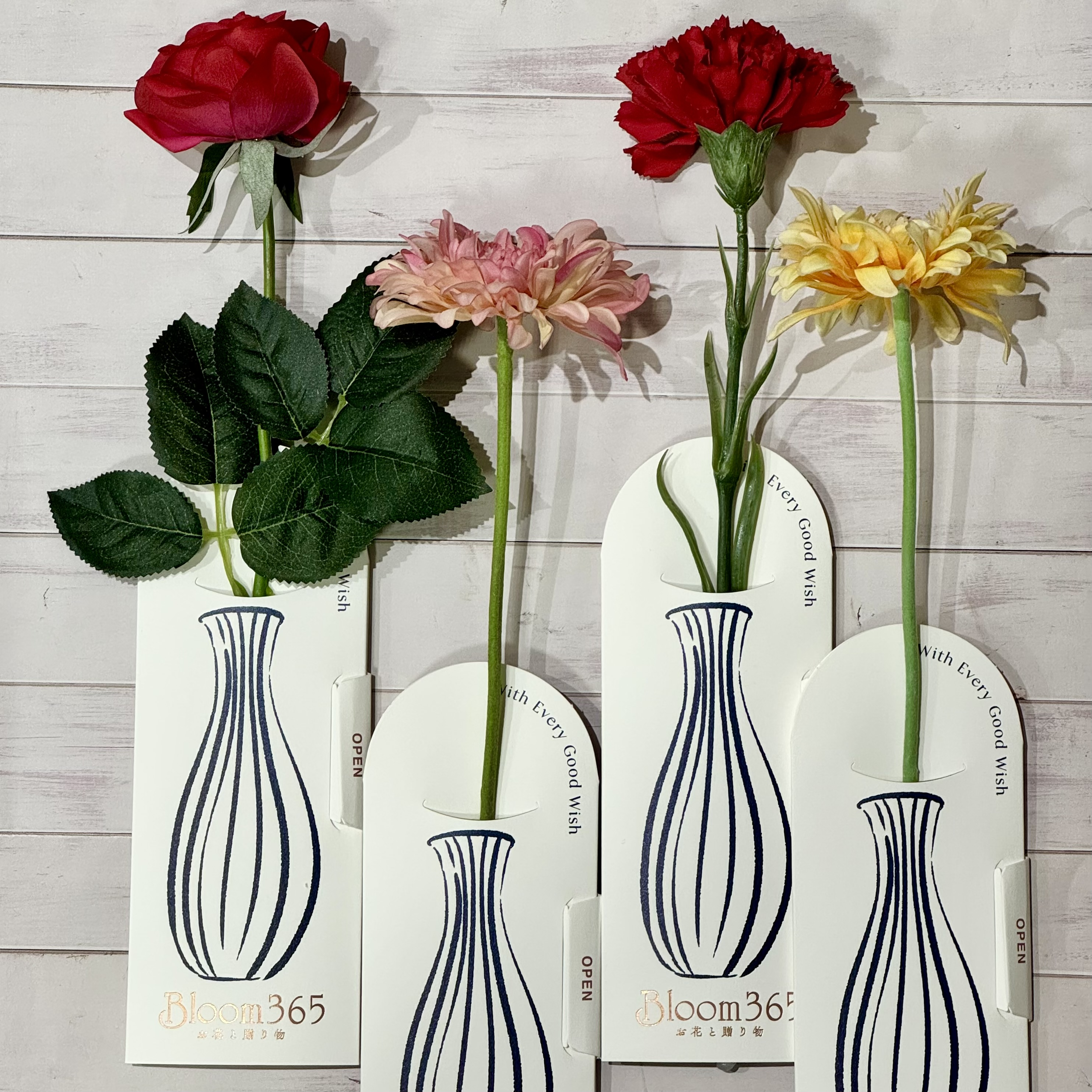 カーネーション、バラ、ガーベラ2色の4種のお花から1本。4種類のコースからカタログギフトを1つ選んでもらうタイプの商品です。