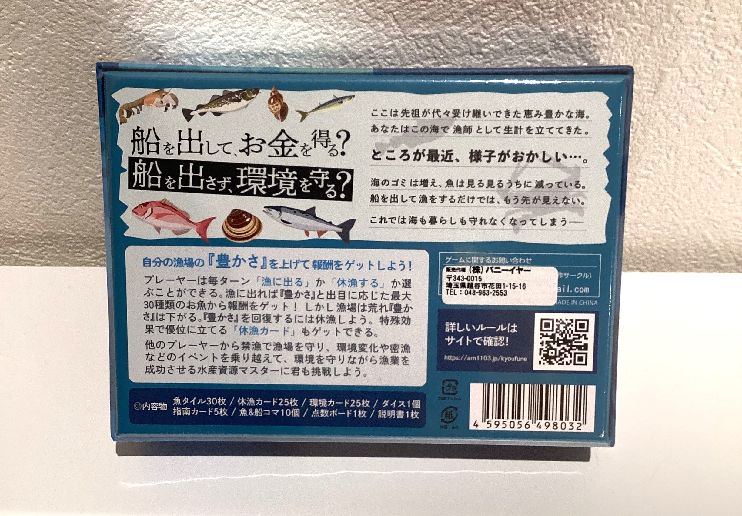 プレイヤーが先祖代々受け継いできた恵み豊かな海で暮らす漁師になり、魚を獲ってお金を稼ぐボードゲーム。海の汚染、魚の獲りすぎ、不漁に気を付けて、高級な魚がとれる「海の豊かさ」を維持出来るように立ち回りましょう。漁師としての腕と運、漁場を管理する冷静さが必要となるボードゲームをぜひお楽しみください。
