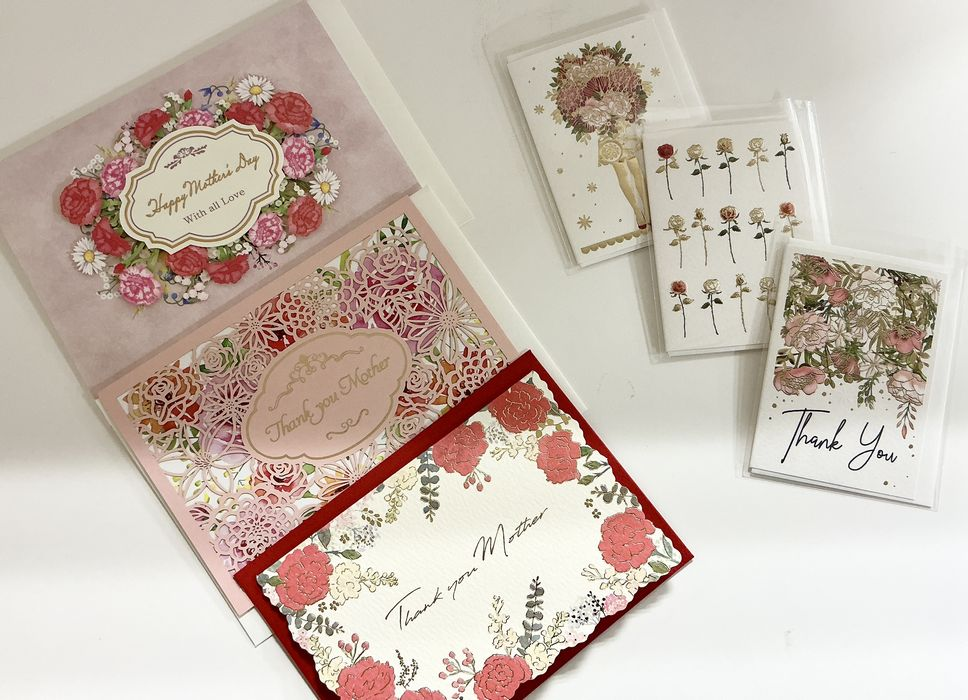 華やかな花束や繊細なレーザーカットが美しいカーネーション、金箔やリボンをあしらった上質なものまで、飾っておきたくなるデザインのカードを取りそろえました。