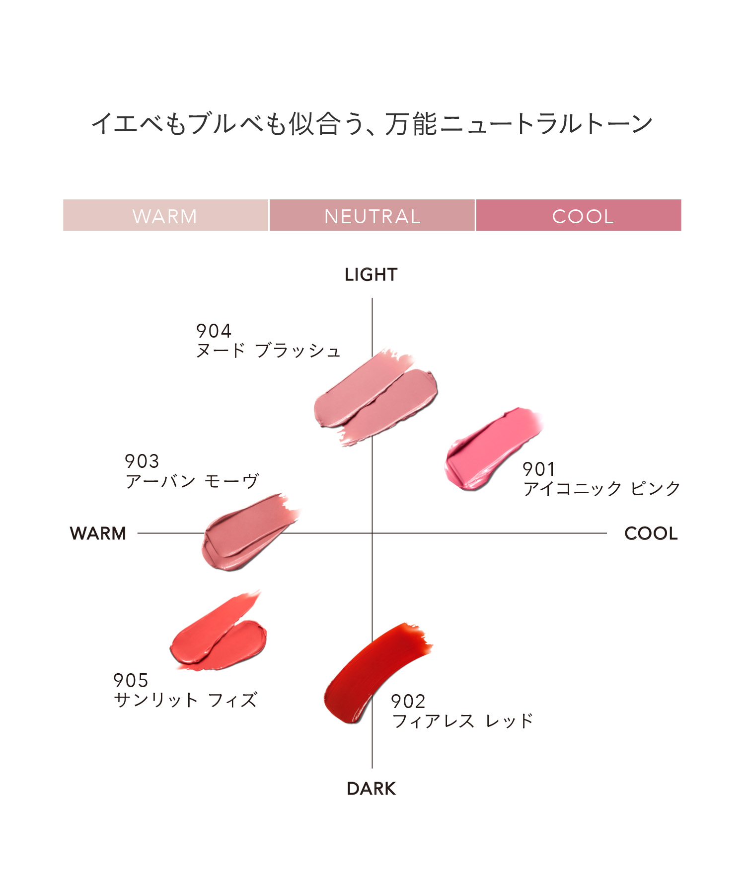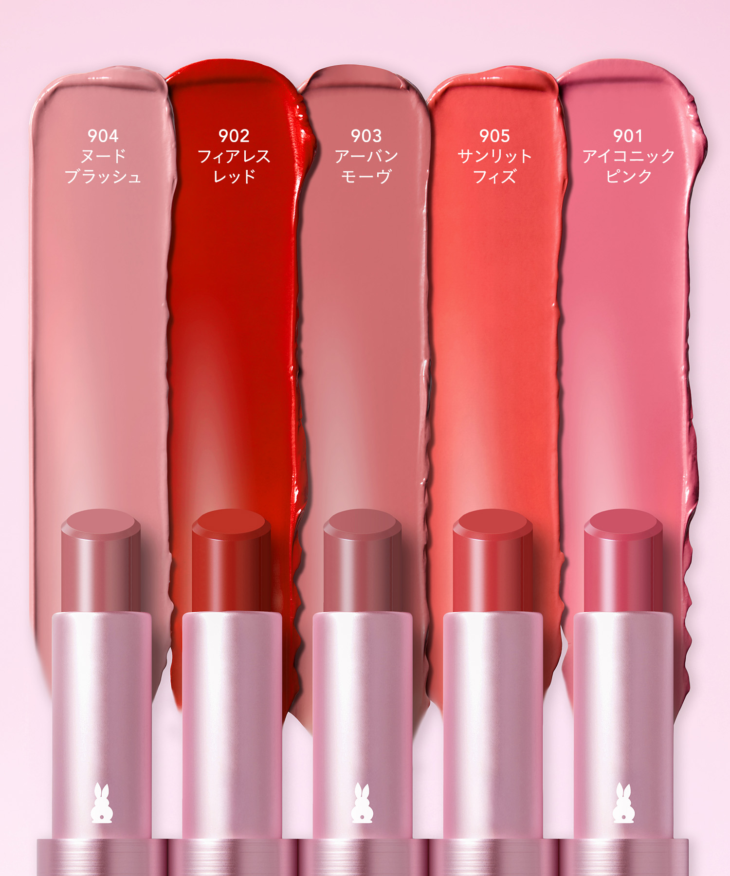 (901 アイコニック ピンク、902 フィアレス レッド、903 アーバン モーヴ、904 ヌード ブラッシュ、905 サンリット フィズ)