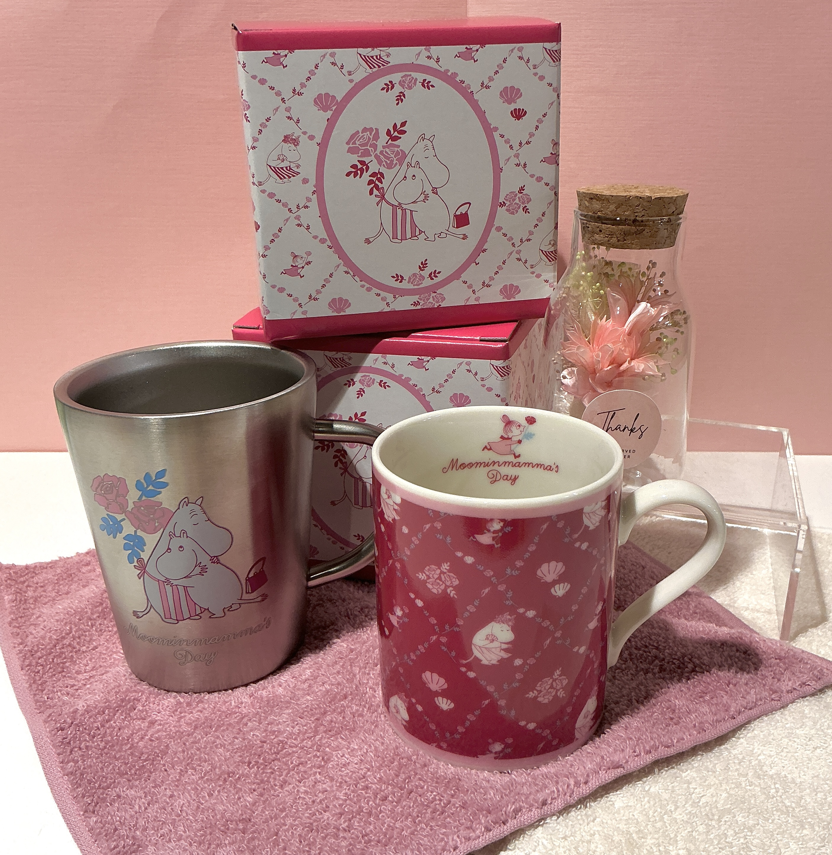 石鹸でできた、水やり不要のシャボンフラワーのブーケは飾るだけでいつものお部屋を華やかに彩ります。その他にもクリアポーチに入ったフラワーギフトや、リラックスタイムに癒しを感じられるムーミンのマグカップなど母の日にオススメの商品をご用意しております。