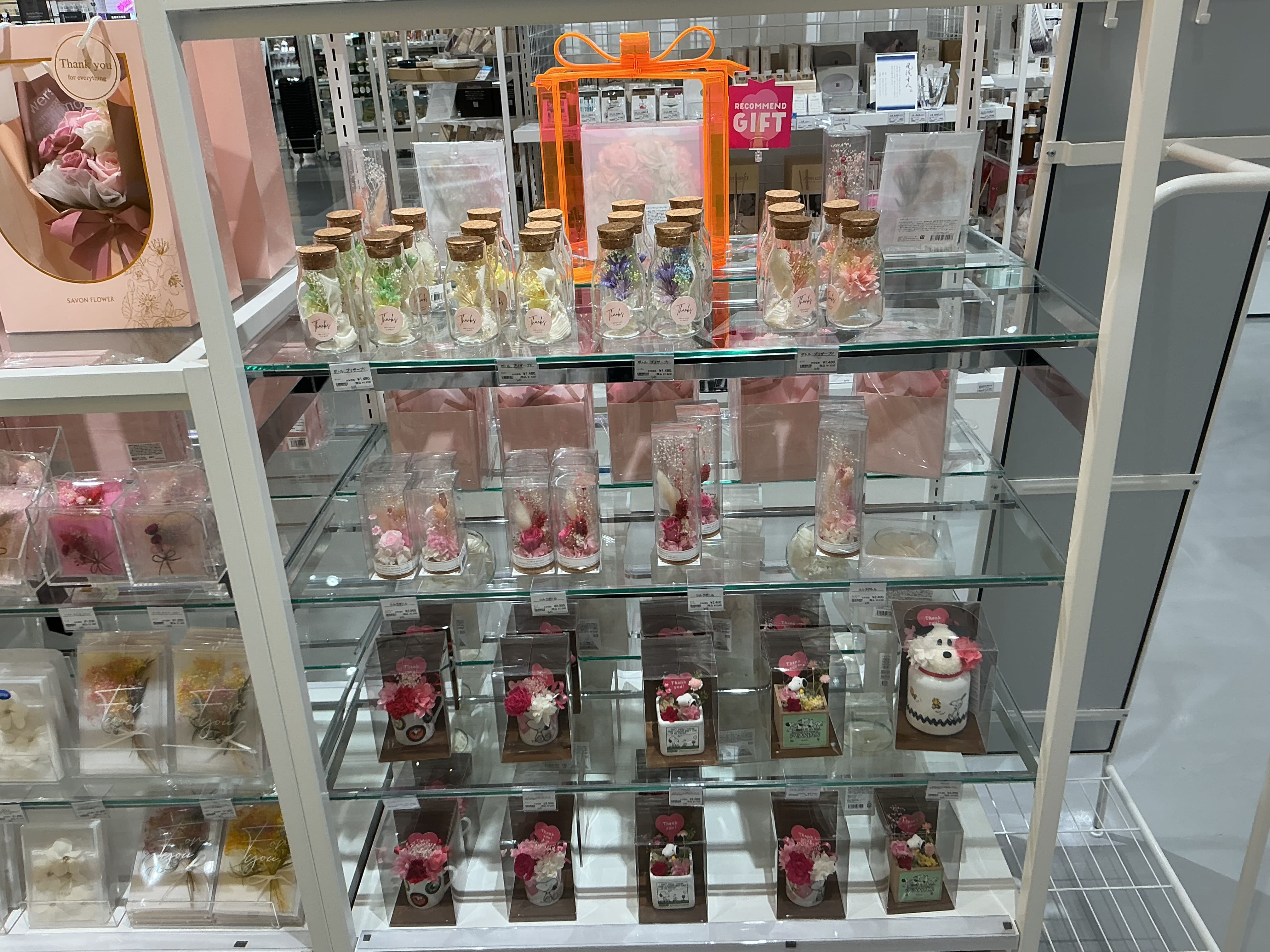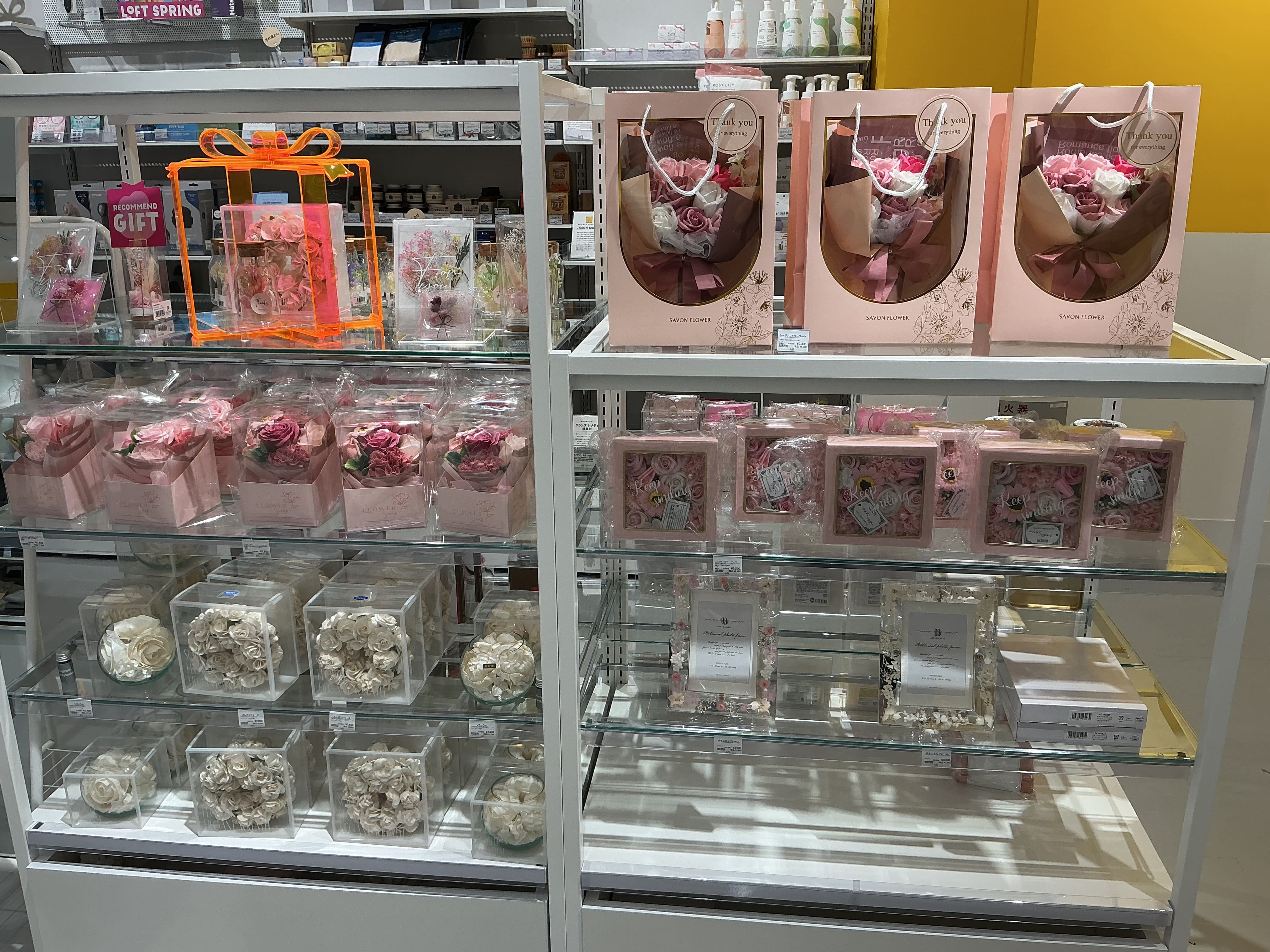 色鮮やかなシャボンフラワーをはじめ、プリザーブドフラワーやアロマポプリなど、フラワーモチーフの様々なギフトを取りそろえました。