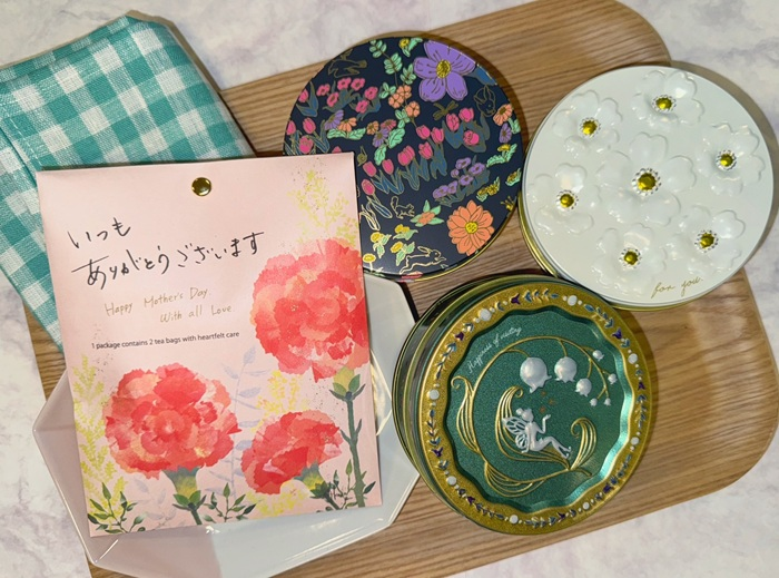 母の日仕様のカーネーションとメッセージ入りパッケージの紅茶や、かわいらしい焼き菓子入りの缶入りクッキー、優しい色合いの夫婦箸など、普段の感謝の気持ちを伝える「ありがとう」ギフトをあつめました。