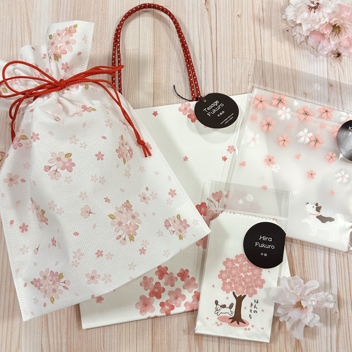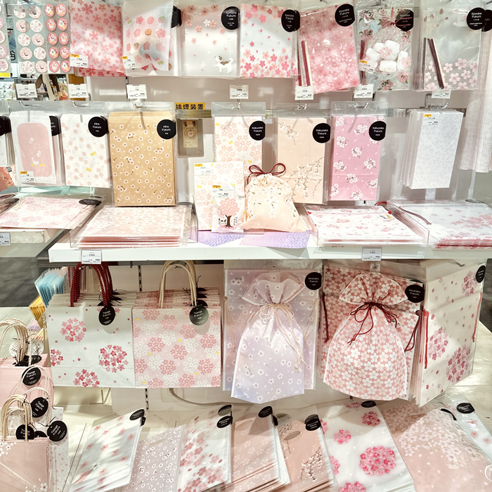 ただいま文具売場では、小分け袋から手提げまで、さまざまなシーンにお使いいただける桜モチーフのラッピングアイテムを取り揃えております。