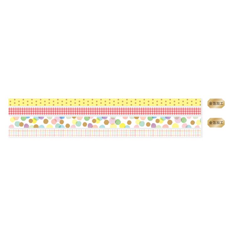 テープカッター付きの透明ケースには、6mm幅×3巻・9mm幅×1巻/合計4種の統一感あるデザインが入っています。