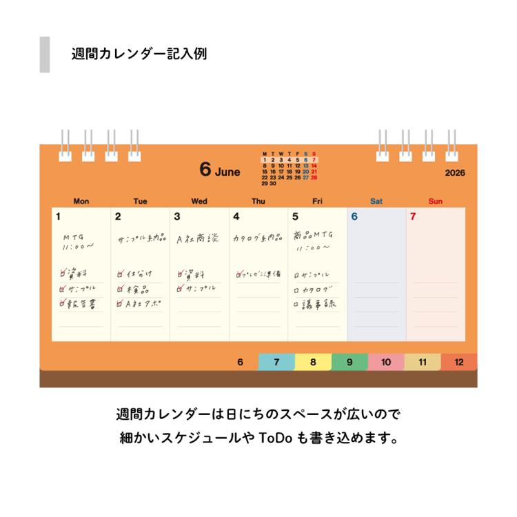 週間カレンダーは日にち部分のスペースが広い為、細かいスケジュールやToDoを書き込めます。