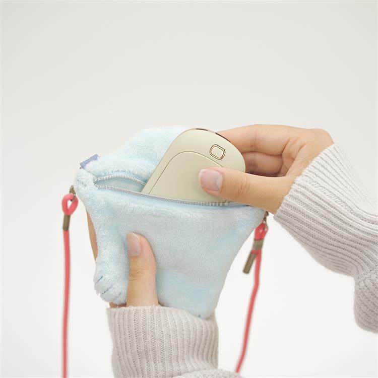 ・ふわふわ生地の収納ポーチには、ショルダー紐付きで持ち運びラクラク。