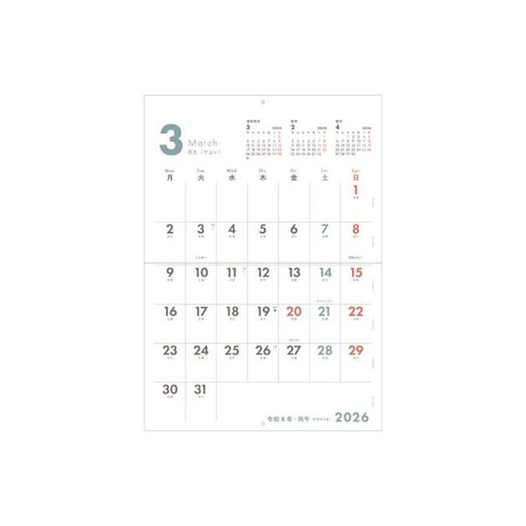 1月始まり/月曜始まりのシンプルかつ、機能的な壁掛けカレンダー。