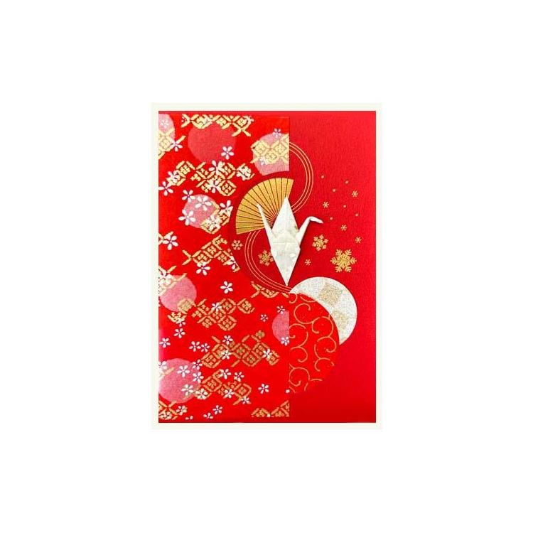 鮮やかな紅の中に白い鶴が美しいデザインです。