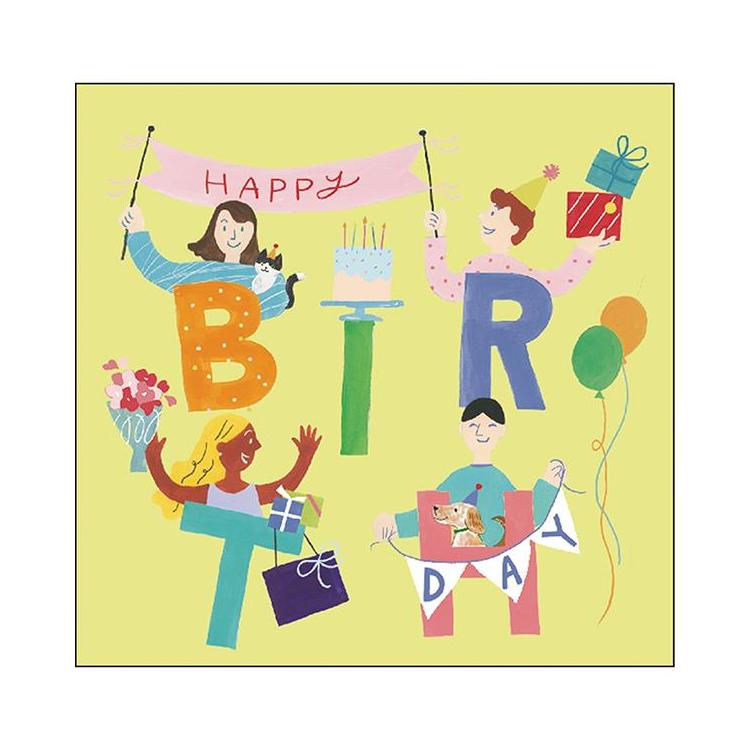 文字を人々に変形させた可愛いデザインのバースデーカードです。