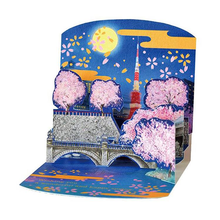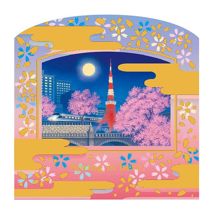 夜の桜と都市の風景を組み合わせたデザインで、開くと東京タワーと夜桜の情景が展開します。