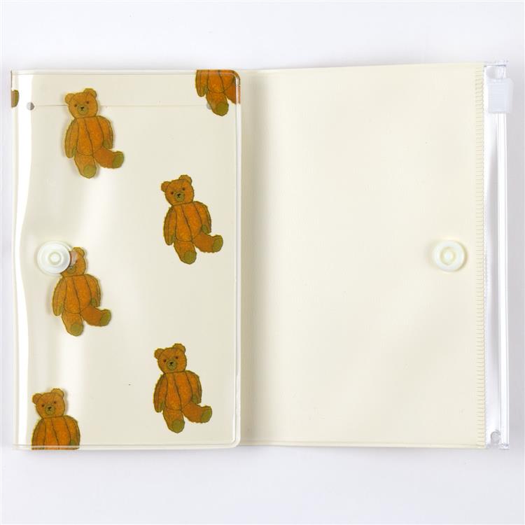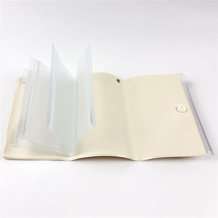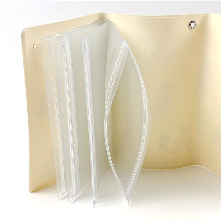 表紙のスライダーポーチと、中の4つのポケットを活用して便利に収納できます。