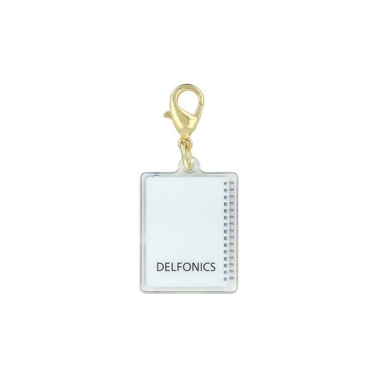 フックが2つついたアクリル製のチャームは、長さ調整が可能です。