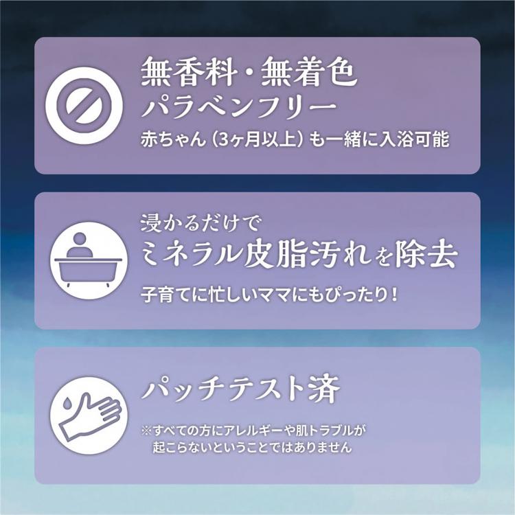 ・本品は飲食物ではありません。・皮膚あるいは体質に異常がある場合は、医師に相談してご使用ください。・使用中や使用後、肌に赤み・かゆみ・刺激・はれ等の異常があらわれた時はご使用を中止し、皮膚科専門医等へご相談ください。そのままご使用を続けますと、症状が悪化することがあります。・万一大量に飲み込んだ時は、水を飲ませる等の処置を行って医師にご相談ください。・本品には、浴槽・風呂釜を傷めるイオウは入っておりません。・開封後はすぐにお使いください。・アルミ袋開封後は毎回しっかりとチャックを閉め、湿気を避けて保管してください。・残り湯は洗濯にもお使いいただけますが、すすぎは上水で行ってください。ただし柔軟仕上剤との併用、おろしたての衣料、つけおき等に使用しないでください。・本品と他の入浴剤等の併用はお避けください。・入浴以外の用途には使用しないでください。・大理石・人工大理石の浴槽でのご使用はお避けください。・入浴剤を握ったり、踏みつけたりすると、肌を傷つける場合がありますのでご注意ください。・入浴剤を使用すると、使用しない時よりも浴槽がすべりやすくなることがありますのでご注意ください。・浴槽に成分が付着する場合がありますので、残り湯は長く放置せず洗い流してください。・製品の特性上、割れや欠けがある場合がありますが、品質に影響はありません。・まれに中身が変色することがありますが、品質に問題はありません。・循環式の風呂・全自動給湯器、24時間風呂の場合、機種によってはご使用になれない場合がございます。お使いの機種の説明書を確認の上、ご使用ください。・本品使用後は風呂釜内部、循環孔フィルターを上水でよくすすいでください。・残り湯には無機塩類が多く含まれていますので、植物の水やりに使用しないでください。・高温多湿・直射日光を避け、乳幼児の手の届かないところで保管してください。