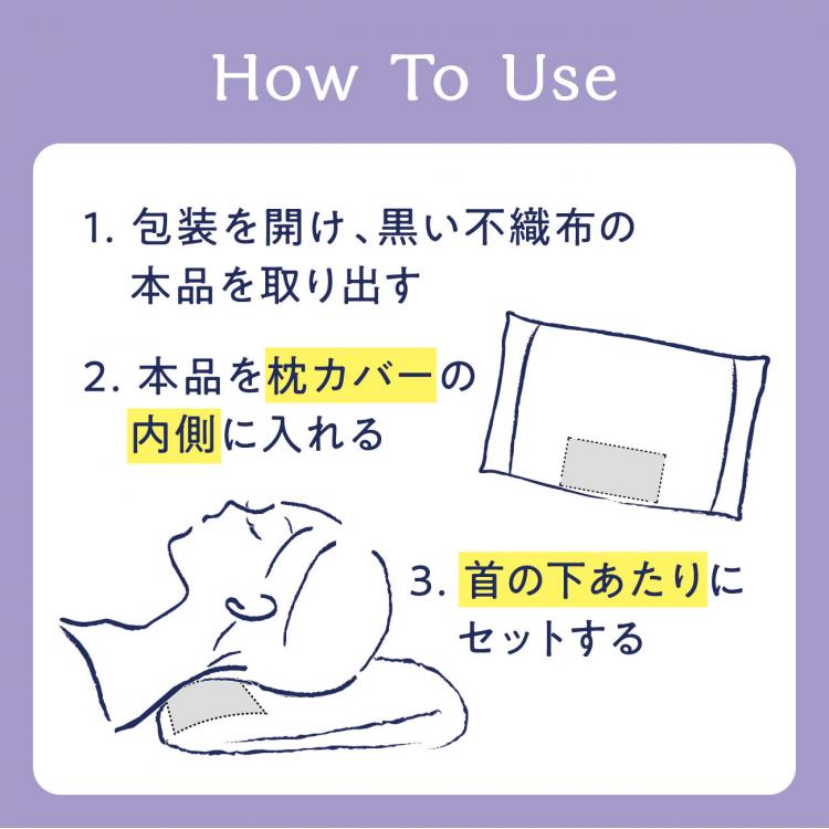 ○本品を枕カバーの内側に入れ、頭ではなく首の下あたりに来るようセットしてください。