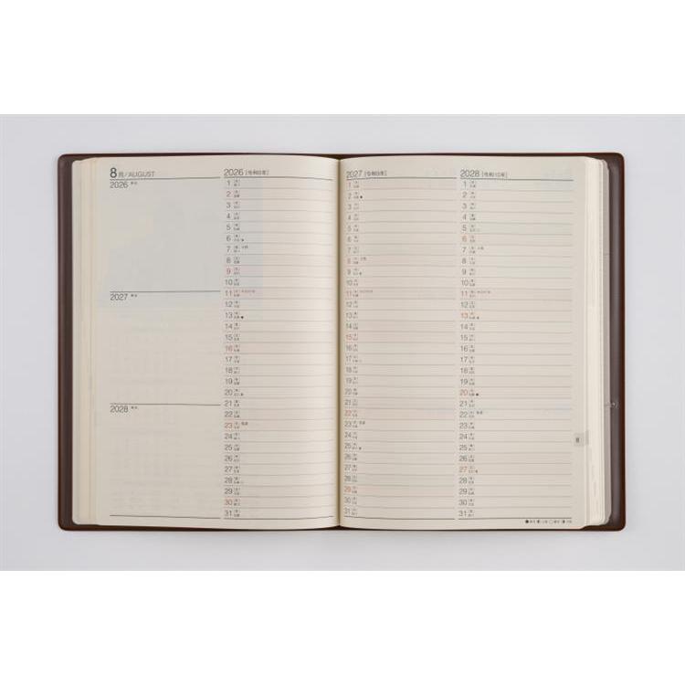 3年分の記録を書き込める連用ダイアリー。横ケイ式の月間ページは3年分の予定が一覧でき、ビジネスや年間行事などの管理に役立つ一冊です。シックなブラウンのカバーは、ビジネスにもプライベートにも。