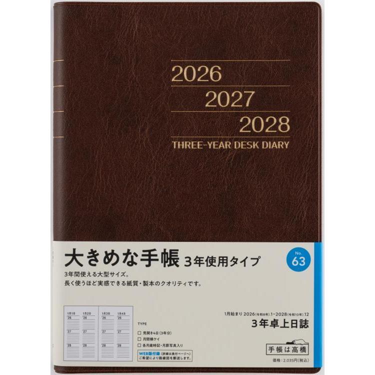 - 2026年1月始まり手帳 週間ブロック A5 3年卓上日誌(63)茶