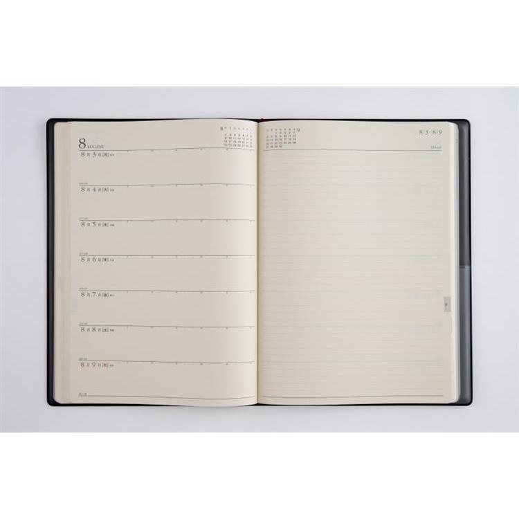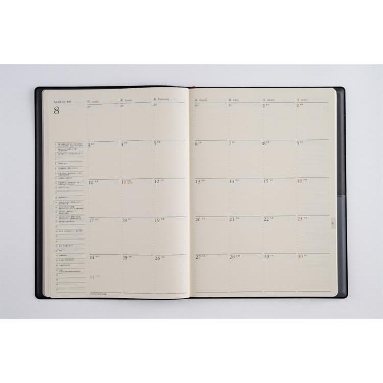 大きくて予定が見やすいB5判のダイアリー。定番のブロック式月間ページと、レフト式の週間ページの組み合わせ。1日の記入スペースが広くて使いやすい、ロングセラー商品です。シックな黒のカバーは、ビジネスにもプライベートにも馴染みます。