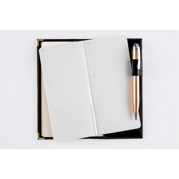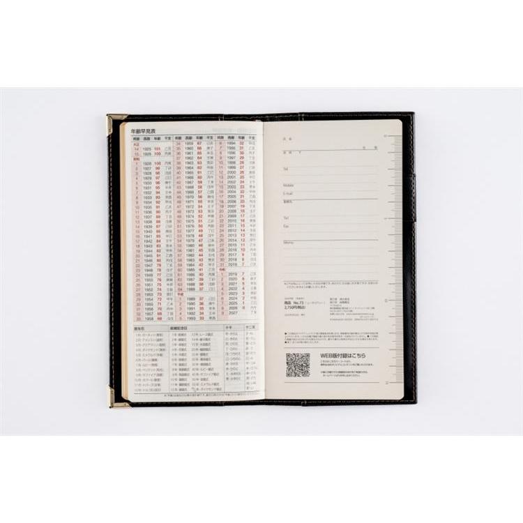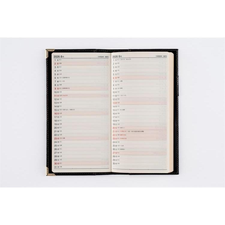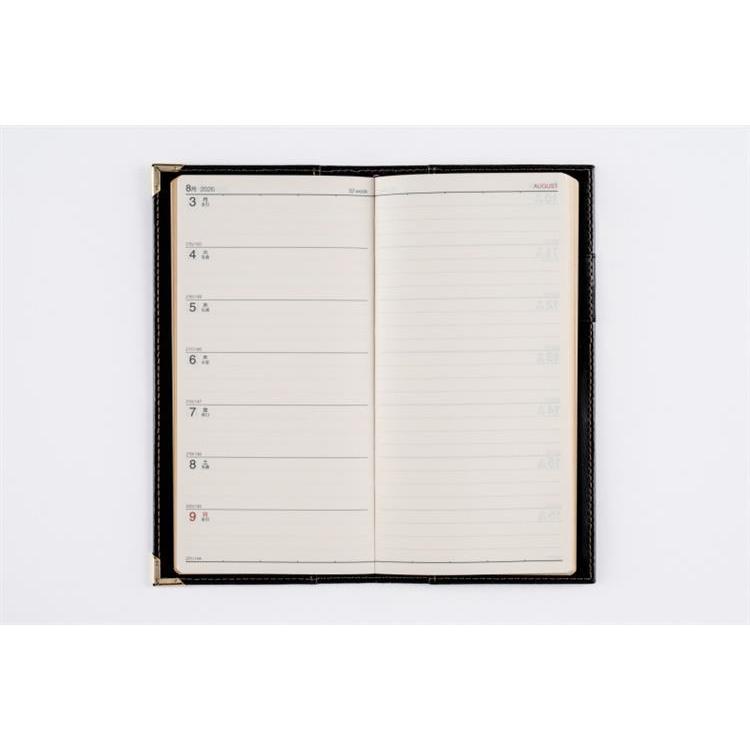 高級皮革調のシックなカバーは、角をしっかり保護する角金具付き。多くのビジネスパーソンに愛されたベーシックな記入形式が人気。月間ページは横ケイ式です。
