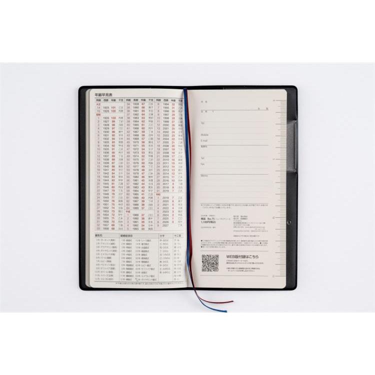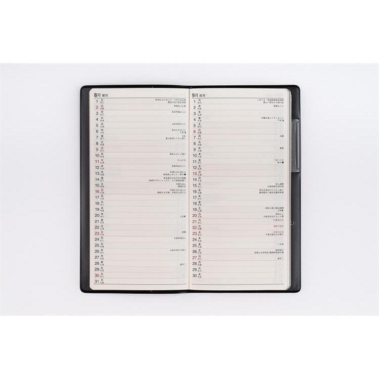 横ケイ式、ブロック式2種類の月間ページが収録されたシンプルな構成。薄型のビジネス手帳をお探しの方におススメの一冊。月間ページは歳時記入りです。