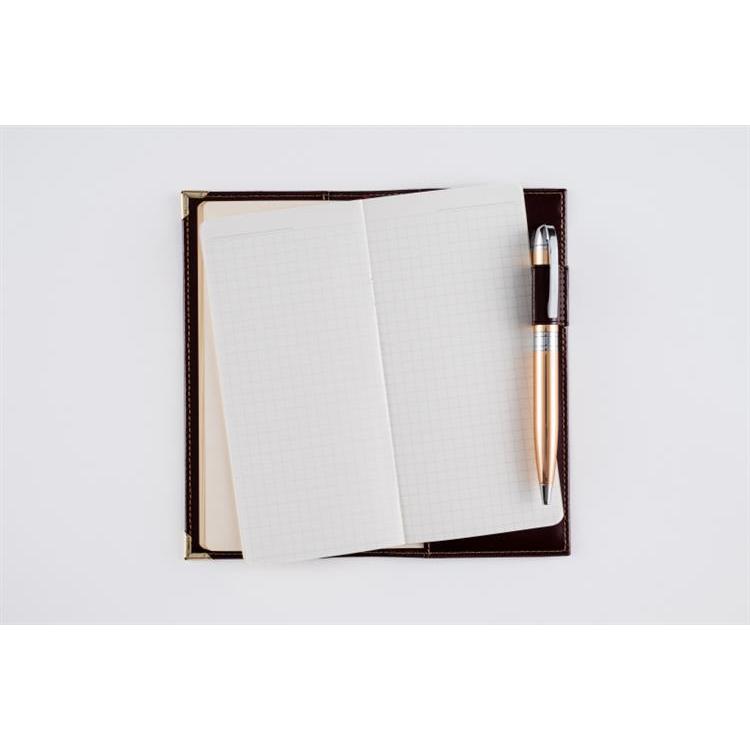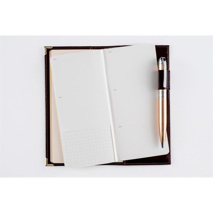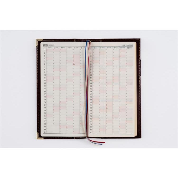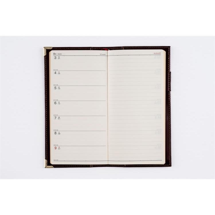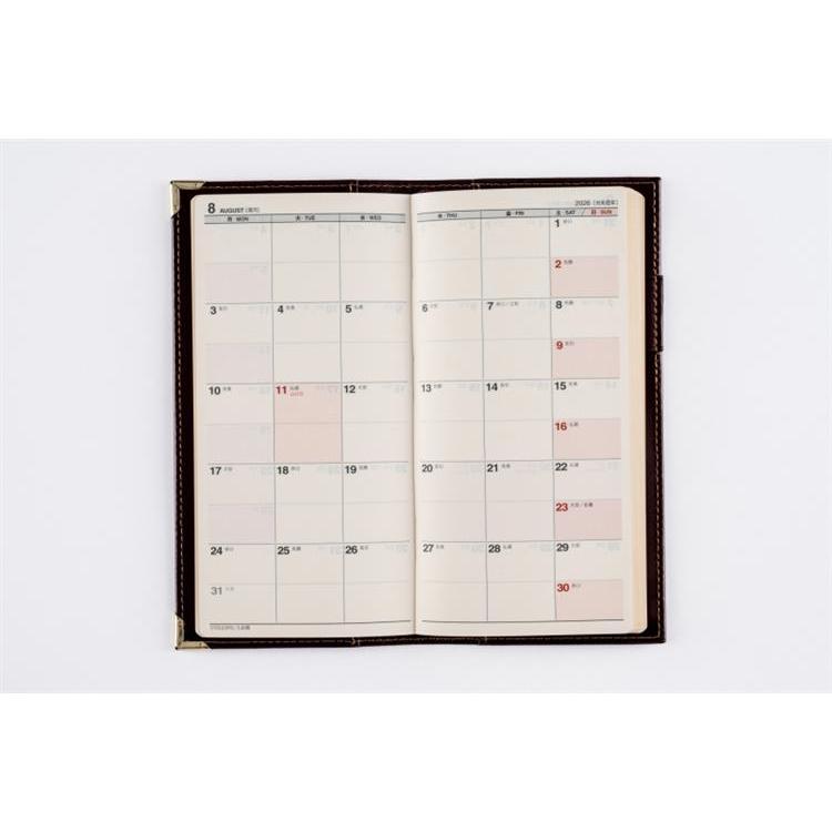 高級皮革調のシックなカバーは、角をしっかり保護する角金具付き。多くのビジネスパーソンに愛されたベーシックな記入形式が人気。月間ページはブロック式です。