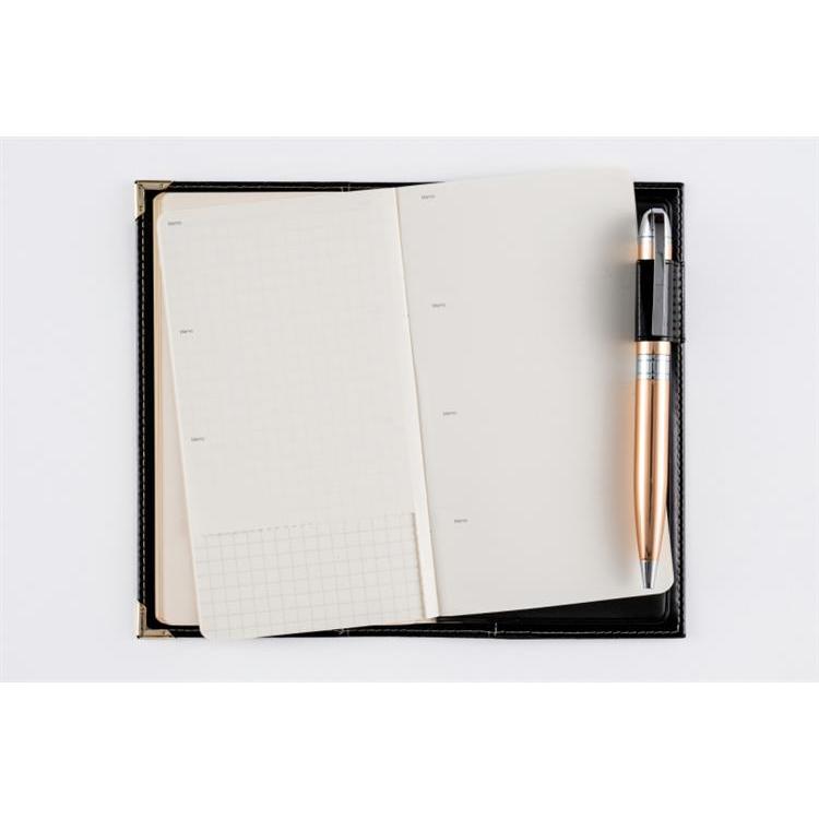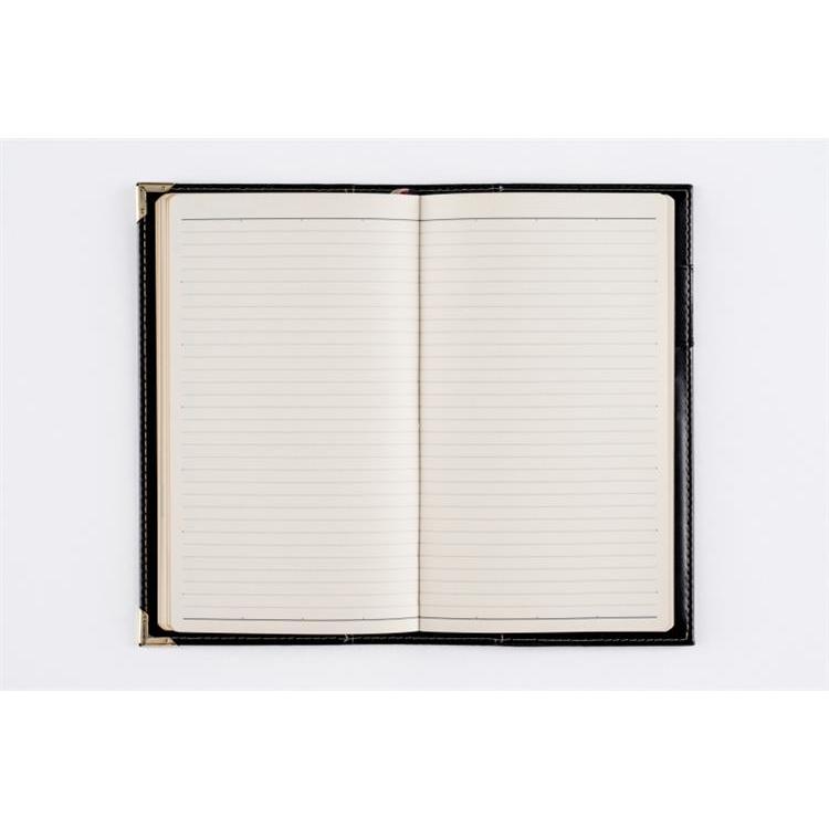 角金具が付いたワンランク上の高級皮革調カバー。金色のシンプルなロゴが高級感を演出します。中身はベーシックな記入形式なのでビジネスの場面に馴染みます。