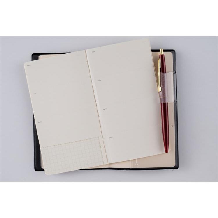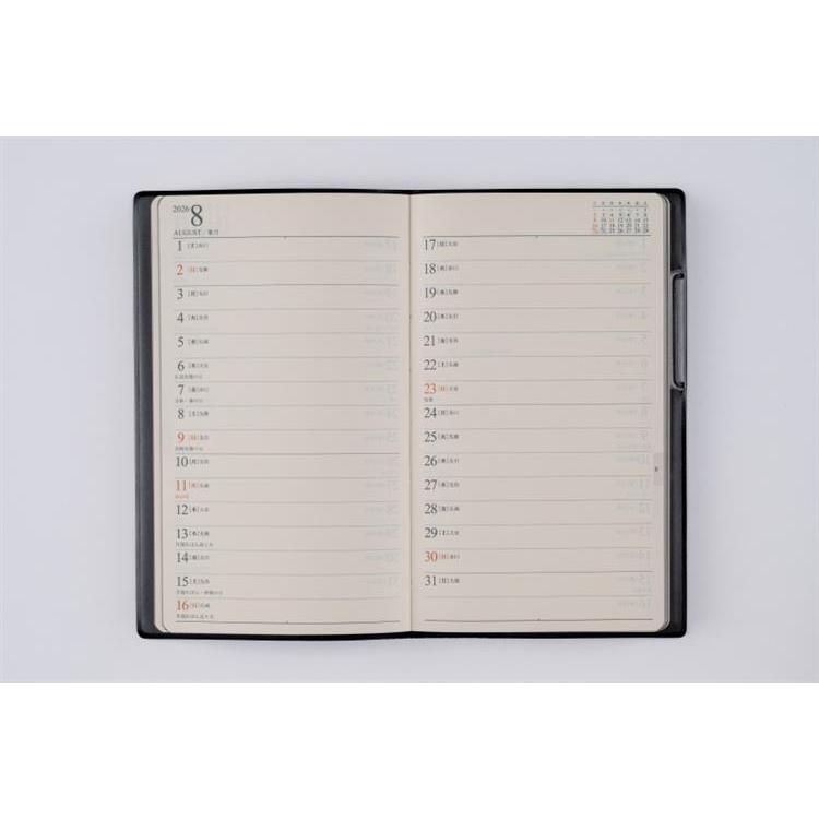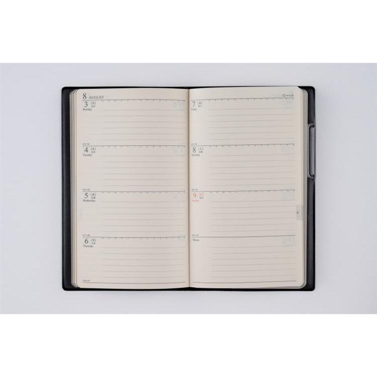 使いやすく、高級感のある皮革調。シックな黒の装丁です。月間ページは、進行中のプロジェクトや週をまたぐ予定を管理しやすい横ケイ式カレンダーを収録しています。