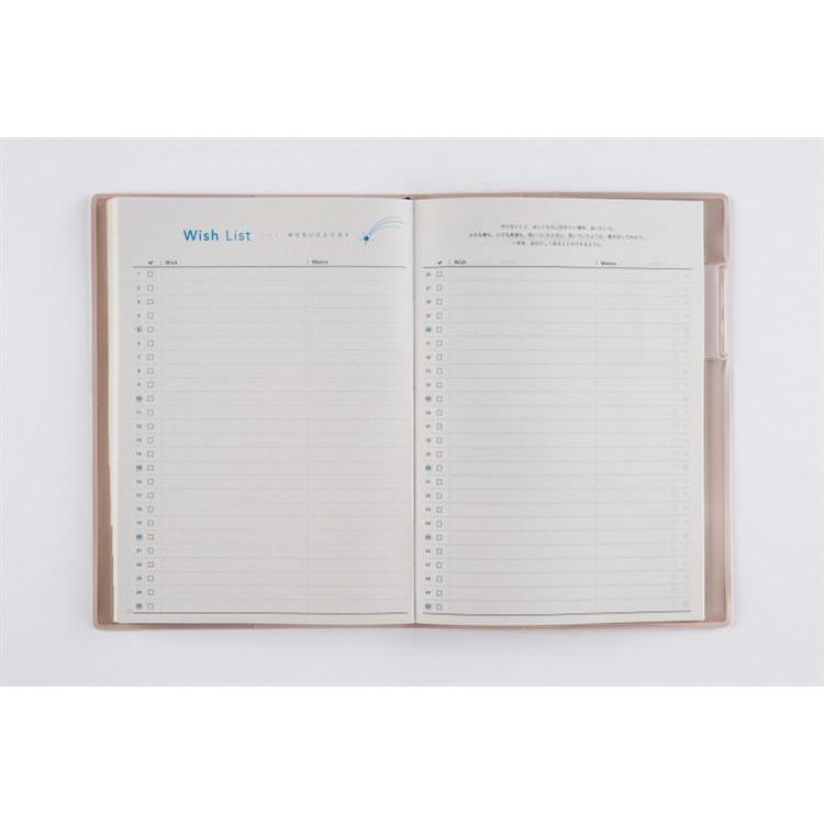シンプルながらも、使いやすさにこだわったレイアウトは、毎日楽しく書き続けられる工夫がたくさん。巻末には、やりたいこと、行きたい場所など自由に描ける付録も充実。