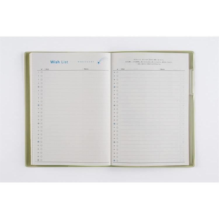 シンプルながらも、使いやすさにこだわったレイアウトは、毎日楽しく書き続けられる工夫がたくさん。巻末には、やりたいこと、行きたい場所など自由に描ける付録も充実。