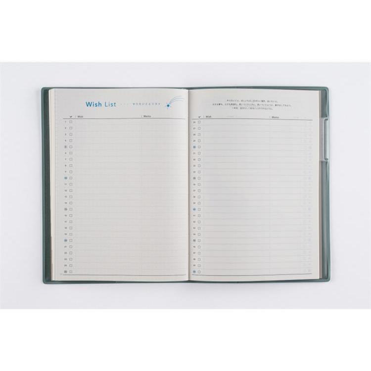 シンプルながらも、使いやすさにこだわったレイアウトは、毎日楽しく書き続けられる工夫がたくさん。巻末には、やりたいこと、行きたい場所など自由に描ける付録も充実。